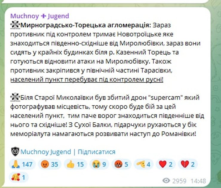 "Мирноградско-Торецкая агломерация. Сейчас противник под контролем держит Новотроицкое, которое расположено юго-восточнее Миролюбовки, сейчас ВС РФ сидят в крайних домах у реки Казенный Торец и готовятся возобновить атаки на Миролюбовку", — написал "Мучной".