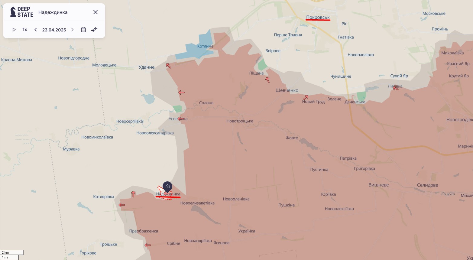 Между тем OSINT-аналитик с ником Moklasen установил координаты точек под Надиевкой, в которых подорвалась техника ВС РФ. Также он назвал, что именно взлетело в воздух: узнал три бронетранспортера, одну бронемашину, одну "Ладу" и два мотоцикла. В анонимном аналитическом Telegram-канале In Factum на карте обозначили точки подрыва и показали направление наступления РФ, которое удалось остановить на юго-запад от Покровска. Также отмечается, что колонны техники РФ уничтожены дистанционно, без привлечения артиллерии и дронов.