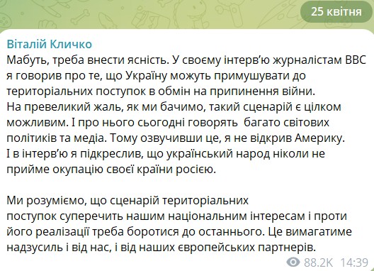 Слова Кличко о возможных территориальных уступках прозвучали в интервью агентству BBC, а уточнение позиции мэр опубликовал в Telegram-канале.