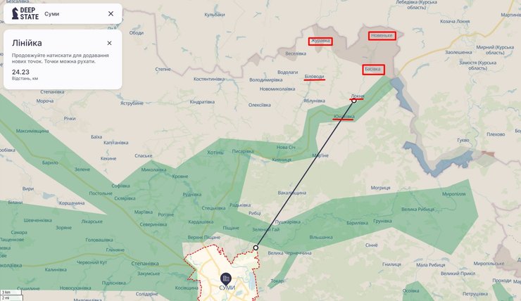 На карте аналитиков DeepState видим серую зону к северу от Сум, в которой происходят боевые столкновения ВСУ с подразделениями ВС РФ. Аналитики обозначили три села в Сумской области, о которых упомянула Яцына: они находятся в зоне боев. Также видим, что от обозначенной линии боев до центра Сум — около 30 км. Чтобы до центра города было 25 км, враг должен добраться за Юнаковку (по прямой). З другой стороны, 25 км — расстояние от Локни до окраин Сум.