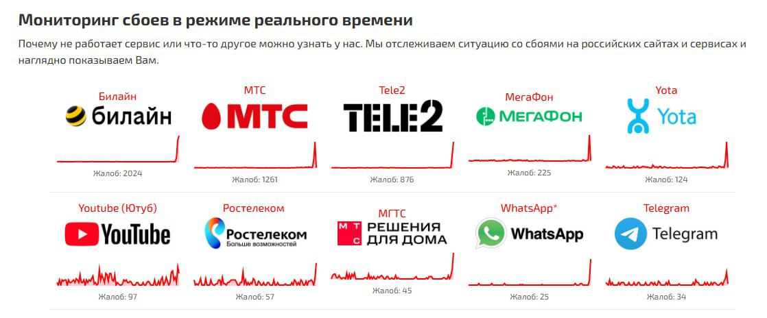 На отсутствие сети пожаловались пользователи операторов "Билайн", "Мегафон" и МТС. Портал для мониторинга сбоев также зафиксировал резкое увеличение жалоб на целый ряд мобильных операторов.