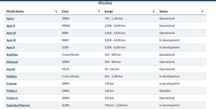Кроме этого, баллистические ракеты Agni заявляются как исключительно ядерное снаряжение, а ракеты типов Agni-I, Agni-II, Agni-III и Prithvi-II находятся в пользовании ракетных бригад Сухопутных войск Индии и Стратегических сил сдерживания Индии.