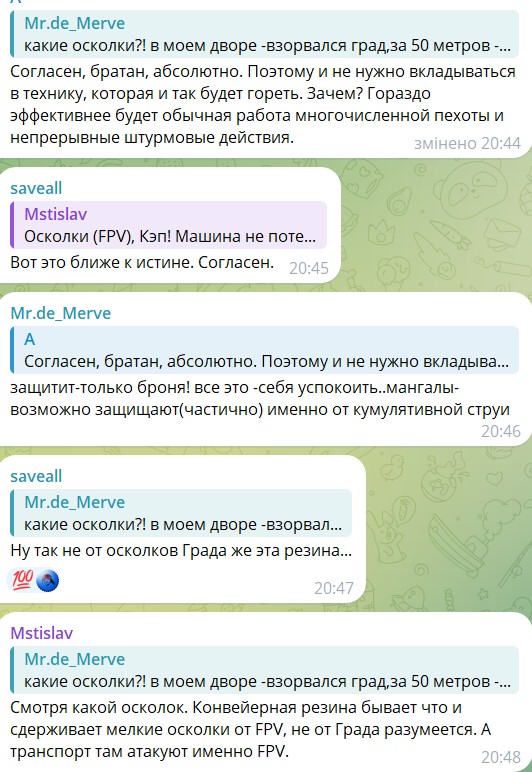 Под заметкой военкора РФ появилась реакция россиян на новое изобретение: они удивлялись "оружию победы". Часть комментаторов сомневалась, что кусок резины убережет от обломков РСЗО, но предполагали, что возможна защита от БПЛА. Также жаловались, что резина скорее загорится, чем убережет от FPV-дрона. Также предполагали, что для "надежности" кузов можно было бы выложить кирпичами. Кроме того, некоторые из россиян объяснил, что улучшение КАМАЗа — бесполезная работа, поскольку ВС РФ для получения преимущества "кладет" пехоту, а не военные машины.