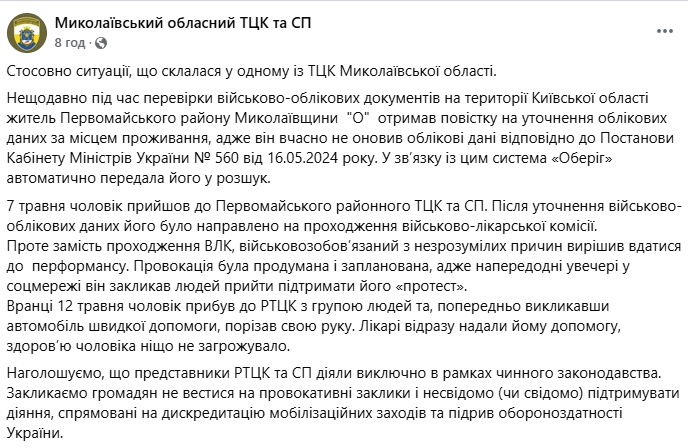 Сообщается, что мужчина утром 12 мая предварительно вызвал бригаду "скорой", пришел в районный ТЦК с "группой людей" и там порезал себе руку. в пресс-службе ведомства утверждают, что медики сразу оказали военнообязанному помощь и угрозы его здоровью не было. В областном ТЦК заявили, что военнослужащие районного территориального центра действовали в рамках действующего законодательства, и призвали "не вестись на провокационные призывы", которые дискредитируют мобилизацию в Украине и подрывают обороноспособность.
