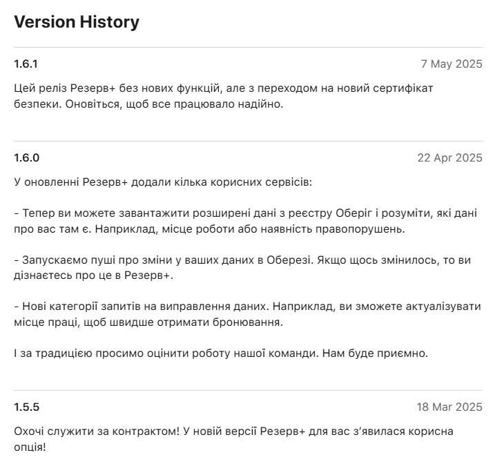 На Google Play и App Store указана дата обновления Резерв+ — это 6 мая 2025 года. В описании приложения есть информация о сертификате безопасности и о необходимости обновления. Также можно увидеть, что команда Минобороны выпускает новые релизы ежемесячно, а в марте 2025 года версий было аж три.