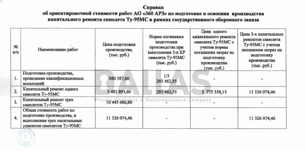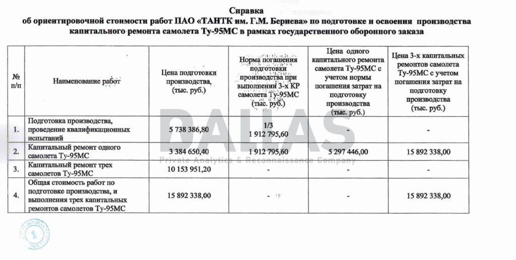 Согласно опубликованной информации, в марте Минобороны РФ одобрило финансирование капитального ремонта шести стратегических бомбардировщиков Ту-95МС. Работы общей стоимостью свыше 270 млн долларов США поручены 360-му авиаремонтному заводу в Рязани и Авиационному научно-техническому комплексу имени Бериева в Таганроге. Причем в среднем, к примеру, капитальный ремонт одного Ту-95МС обходится в 52,7 млн долларов.