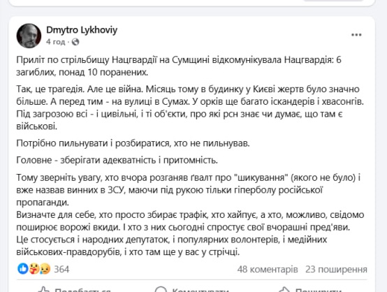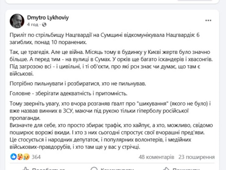 "Прилет по стрельбищу Нацгвардии на Сумщине откоммуницировала Нацгвардия: 6 погибших, более 10 раненых. Да, это трагедия. Но это война. Месяц назад в доме в Киеве жертв было значительно больше. Нужно следить и разбираться, кто не следил. Главное — сохранять адекватность и вменяемость", — написал Дмитрий Лиховий.