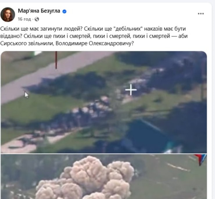 "Сколько еще должно погибнуть людей? Сколько еще "дебильных" приказов должно быть отдано? Сколько еще спеси и смертей, спеси и смертей, спеси и смертей — чтобы Сырского уволили, Владимир Александрович?" — написала она.
