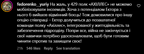"К сожалению, в 429 полк "Ахиллес" не можем мобилизовать иностранцев. Хотя с потенциалом Эктора из него бы получился отличный боец! Поэтому договорились о другой опции сотрудничества — Эктор присоединится к внештатной команде полка "Ахиллес", интегрированной в жизнедеятельность и обеспечение подразделения. Несмотря на все, война не заканчивается и свои навыки нужно совершенствовать, чтобы быть готовым сопротивляться и защищать свое!" — говорится в комментарии.