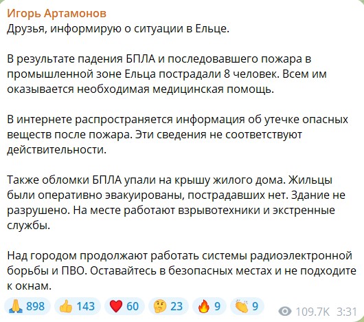 Губернатор Липецкой области Игорь Артамонов в 3:31 сообщил о взрывах на промышленном объекте в городе Елец. По его словам, начался пожар, пострадали восемь человек. Артамонов также успокоил население: утечки вредных веществ не было.