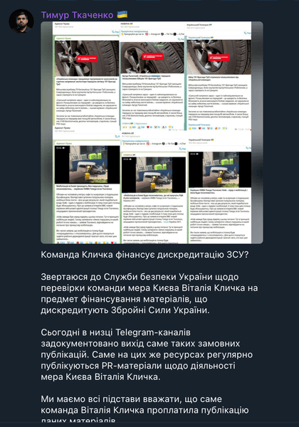 "Сегодня в ряде Telegram-каналов задокументирован выход именно таких заказных публикаций. Именно на этих же ресурсах регулярно публикуются PR-материалы о деятельности мэра Киева Виталия Кличко. Мы имеем все основания полагать, что именно команда Виталия Кличко проплатила публикацию данных материалов", — отметил глава КГВА.