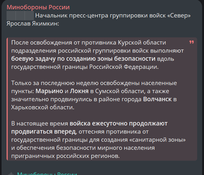 "В настоящее время войска ежесуточно продолжают продвигаться вперед, оттесняя противника от государственной границы для создания "санитарной зоны" и обеспечения безопасности мирного населения приграничных российских регионов", — сказал Якимкин.