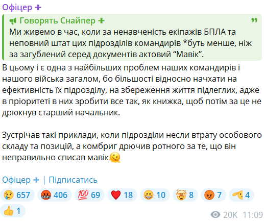"Потому что большинству относительно плевать на эффективность их подразделения, на сохранение жизни подчиненных, ведь в приоритете у них сделать все так, как в книжке, чтобы потом за это не д**кнул старший начальник", — написал военнослужащий.