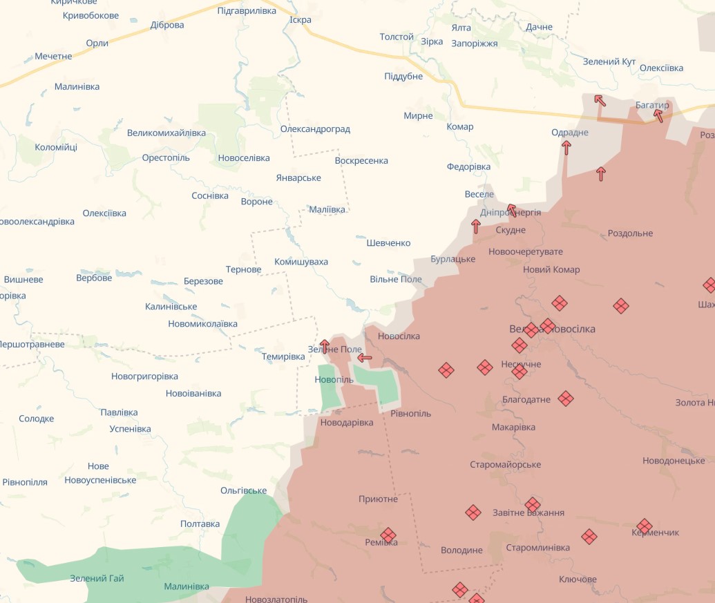 Отметим, населенный пункт Зеленое Поле расположен на западе Донецкой области — всего в 200 метрах от границы с Запорожской областью и в нескольких километрах от Днепропетровской. Также зафиксировано продвижение российских подразделений восточнее — в районе Новоселок.