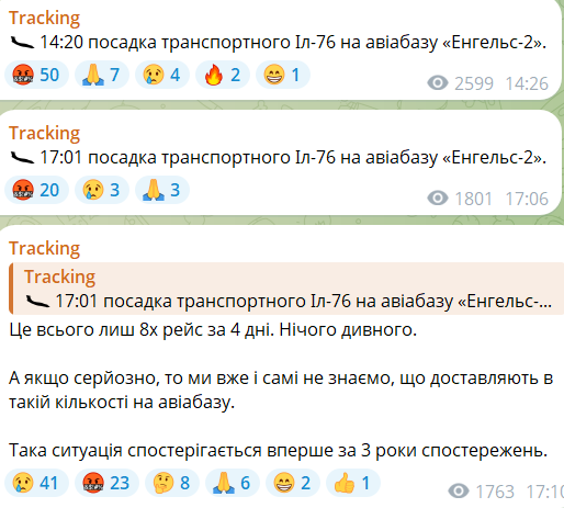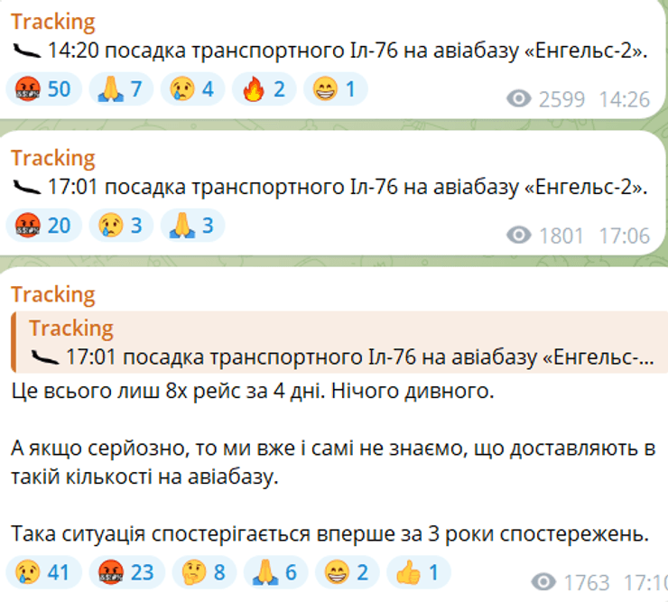 Восемь транспортных самолетов Ил-76 прилетели на авиабазу "Энгельс-2" всего за четыре дня. Как правило, транспортники доставляет крылатые ракеты Х-101/555.