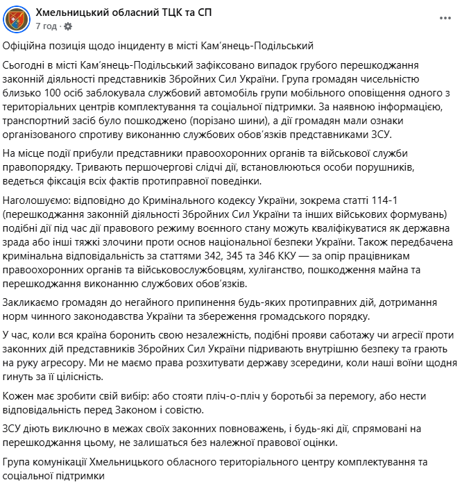 В ТЦК напомнили, что подобные действия по статье 114-1 Уголовного кодекса Украины во время военного положения могут квалифицироваться как государственная измена или другое тяжкое преступление против Национальной безопасности Украины, а также ответственность предусмотрена за сопротивление работникам правоохранительных органов и военнослужащим, хулиганство, повреждение имущества и препятствование выполнению служебных обязанностей по статьям 342, 345 и 346 УКУ.