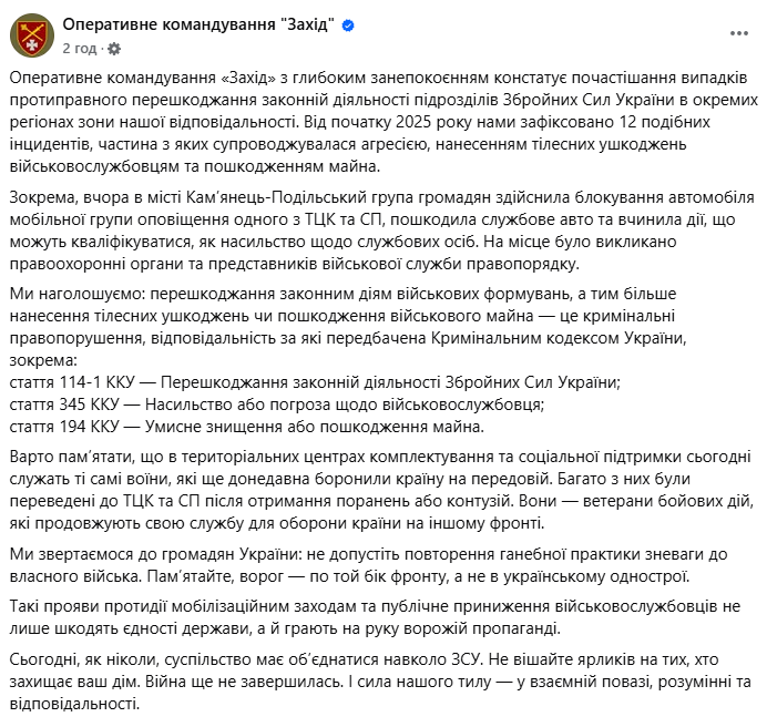 Военные ОК "Запад" отметили, что в отдельных регионах их зоны ответственности участились случаи препятствования деятельности подразделений Вооруженных сил Украины. С начала 2025 года в западных областях произошло 12 инцидентов, некоторые из них сопровождались агрессией, повреждением имущества и нанесением военнослужащим телесных повреждений.