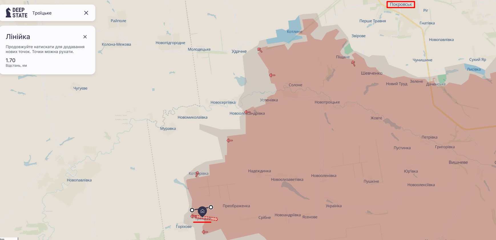 Покровское направление. К западу от Покровска ВС РФ полностью оккупировали село Троицкое, указано в заметке аналитиков. Село, площадью 2 кв. км, расположено на расстоянии 2,7 км от административной границы Днепропетровской области и в 8,7 км от дороги Т0428, которая ведет в Новопавловку. На карте показано смещение линии фронта почти на 2 км.