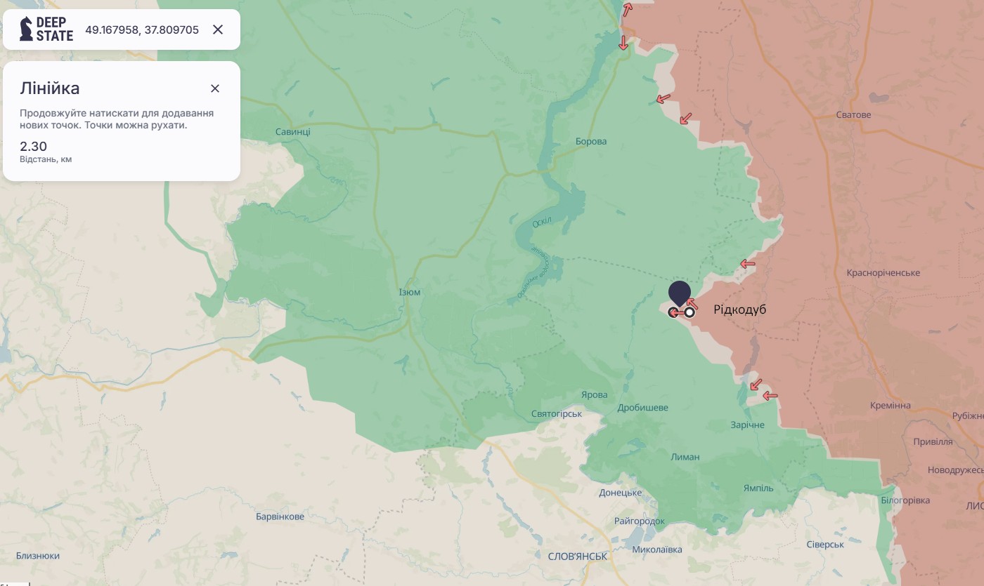Лиманское направление. На отрезке на востоке Харьковской области ВС РФ наступали рядом с селом Редкодуб, говорится в отчете DeepState. На карте видно, что россияне прорвали более чем на 2 км и стали ближе к Изюму и Лиману.