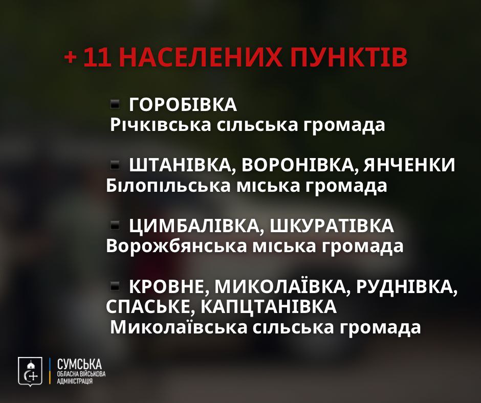 Отмечается, что учитывая постоянную угрозу жизни гражданского населения вследствие обстрелов приграничных громад начальник Сумской ОВА Олег Григоров подписал распоряжение об обязательной эвакуации жителей еще 11 населенных пунктов Сумского района.