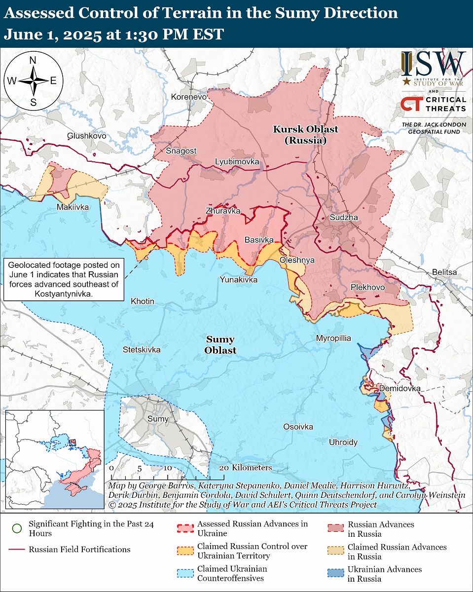 Ранее Министерство обороны России (МО) и другие российские источники заявляли 1 июня, что российские войска захватили Алексеевку (к северу от города Сумы), но один российский военный блогер сообщил, что заявления преждевременны.