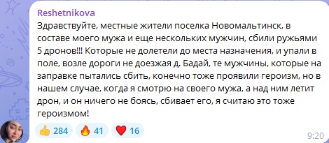 При этом в комментариях под постом губернатора сообщили, что дроны сбивали не только "неравнодушные граждане", но и местные жители из ружей, но их к награде не представили.