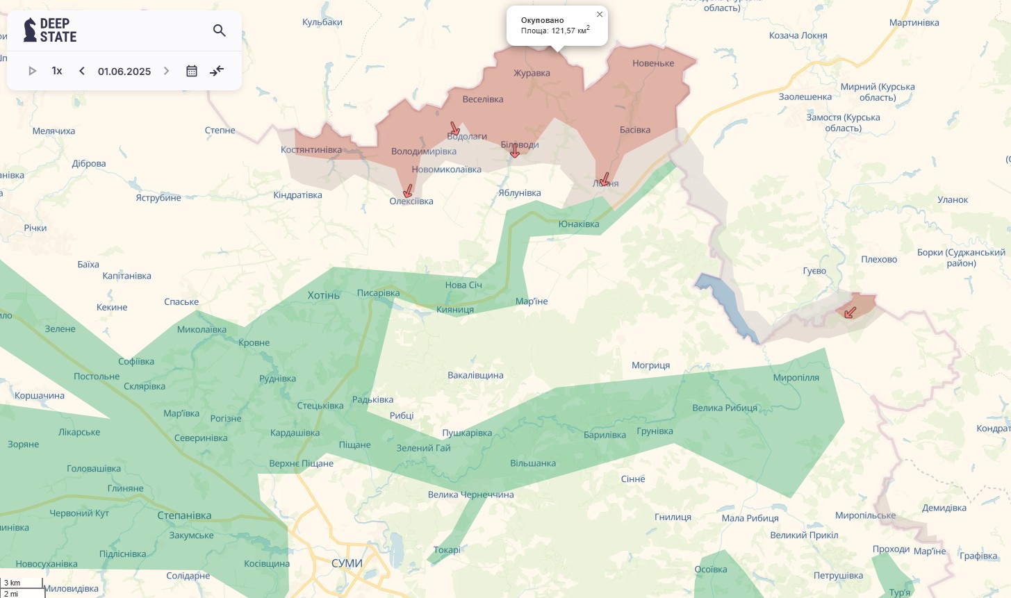 На карте аналитиков DeepState на основе отчетов командования и информации о военных обозначена линия боев по состоянию на 1 июня. Видим два участка, на которых продвинулись россияне. К северу от Сум враг оккупировал 121,57 кв. км и контролирует приграничные села от Константиновки до Новенького и Басовки. Один из "языков" добрался до Локни — села, расположенного в 2–3 км от Юнаковки. Второй красный участок — местность на северо-восток возле Мирополья (3,11 кв. км). Карта демонстрирует темпы продвижения врага: 23 мая — оккупация 65 кв. км, 1 июня — 124,68 кв. км (рост вдвое). Площадь Сумской области почти 29 тыс. кв. км, то есть площадь оккупации — менее половины процента (0,4%).