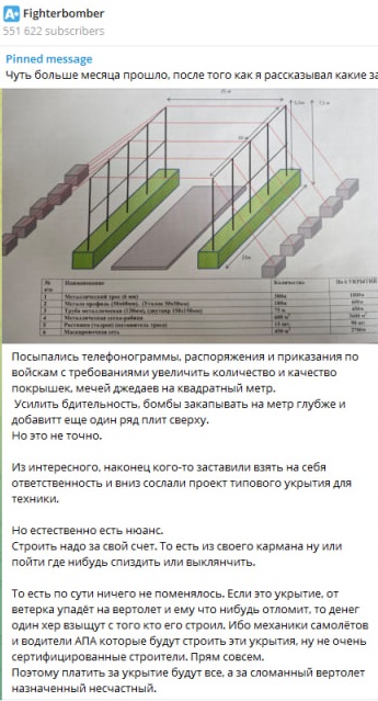 "Посыпались приказы по войскам с требованиями увеличить количество и качество покрышек, мечей джедаев на квадратный метр. Усилить бдительность, бомбы закапывать на метр глубже и добавить еще один ряд плит сверху. Из интересного, наконец, кого-то заставили взять на себя ответственность и вниз заслали проект типового укрытия для техники. Но, естественно, есть нюанс. Строить надо за свой счет. То есть из своего кармана ну или пойти где-то сп**дить или выклянчить", — пишет Туманов.