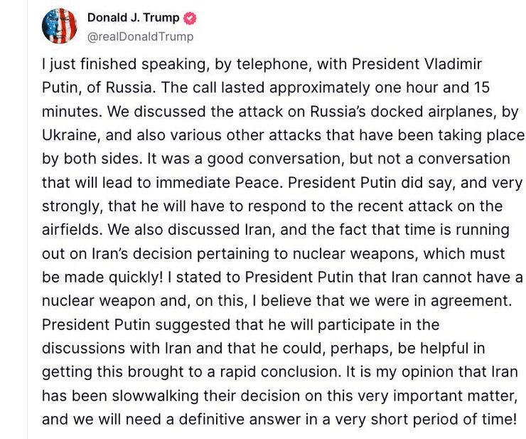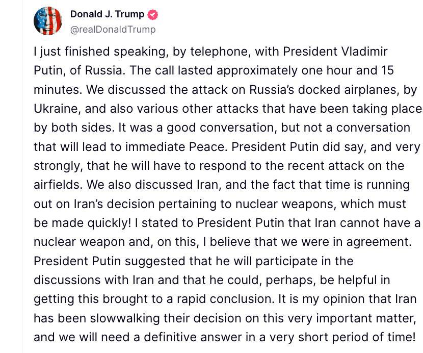 По словам президента США, во время разговора с Путиным главы государств обсуждали атаку Украины на российские самолеты на аэродроме и другие недавние действия обеих сторон. Несмотря на то, что беседа была конструктивной, Трамп подчеркнул, что она не приведет к немедленному миру. Он отметил, что Путин четко заявил о своем намерении ответить на удар по аэродромам.