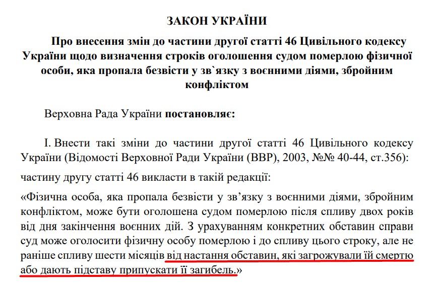 В тексте документа на портале Рады видим, какую правку внесли депутаты. Закон о пропавших без вести определяет, что суды признают умершим человека, пропавшего во время боевых действий
