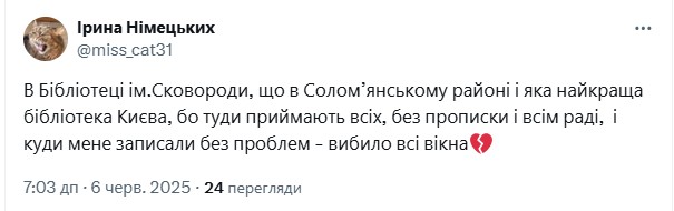 Между тем одна из пользовательниц соцсети X с ником "Ирина Немецких" рассказала о последствиях удара РФ для библиотеки им. Сковороды в Соломенском районе. По ее словам, в библиотеке выбило все окна. Фото или видео с разрушениями пока не отыскалось.