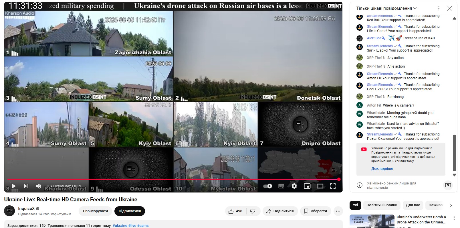 Во время удара Вооруженных сил Российской Федерации, который состоялся в ночь на 6 июня, любой мог увидеть пуски ракет противовоздушной обороны, попадание ракет и дронов, падение обломков. Неизвестные лица подключились к вебкамерам и вывели видео на YouTube. Камеры нацелены на точки, которые, вероятно, интересовали россиян, написал украинский военный корреспондент.