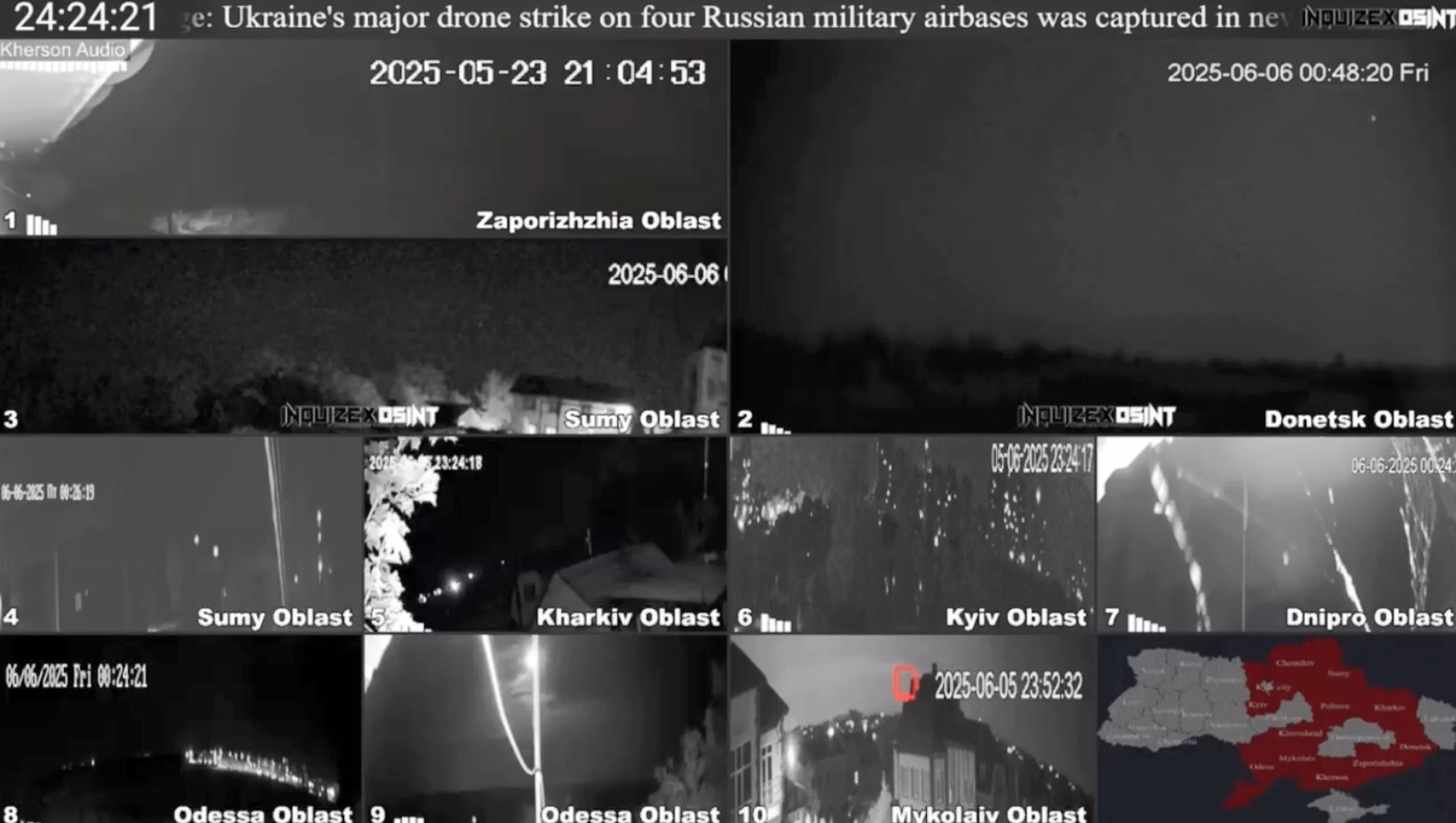 Сообщение Цаплиенко появилось утром 6 июня. Журналист опубликовал 15-секундное видео — фрагмент трансляции 10-11 вебкамер. Видим, что камеры нацелены на точки в Запорожье, Киеве, Сумах, в Донецкой области, под Харьковом, Одессой, Николаевом. На некоторых трансляциях указана дата — 6 июня 2025 года, и время — 0:48, 0:24, или 5 июня 23:52. Автор поста пояснил, что россияне, похоже, имели возможность в прямом эфире следить за эффективностью попаданий, и его удивляет, как такое возможно на четвертом году войны.