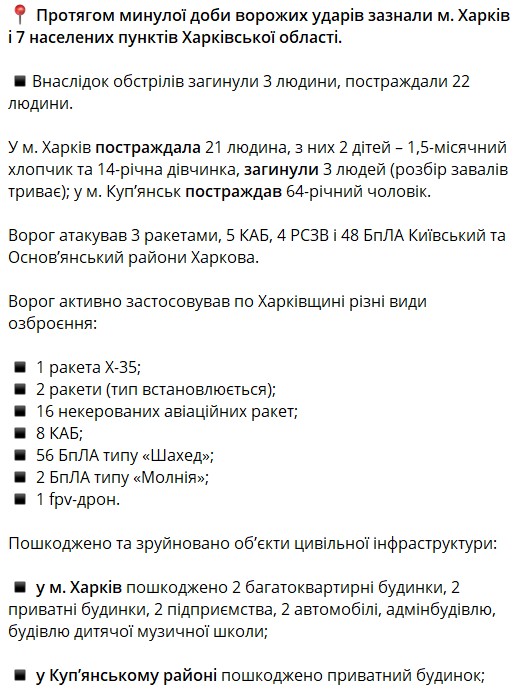 В 8:55 глава Харьковской ОГА Олег Синегубов подвел итоги крупнейшего удара РФ по Харькову 7 июня. Чиновник заявил, что россияне запустили три ракеты (одна Х-35, две — тип пока неизвестен), пять управляемых авиабомб, четыре ракеты РСЗО, 48 беспилотников. Удар пришелся по двум районам областного центра — по Киевскому и Основянскому. Между тем в течение минувших суток в целом по Харьковской области ударили 86 средств поражения ВС РФ.
