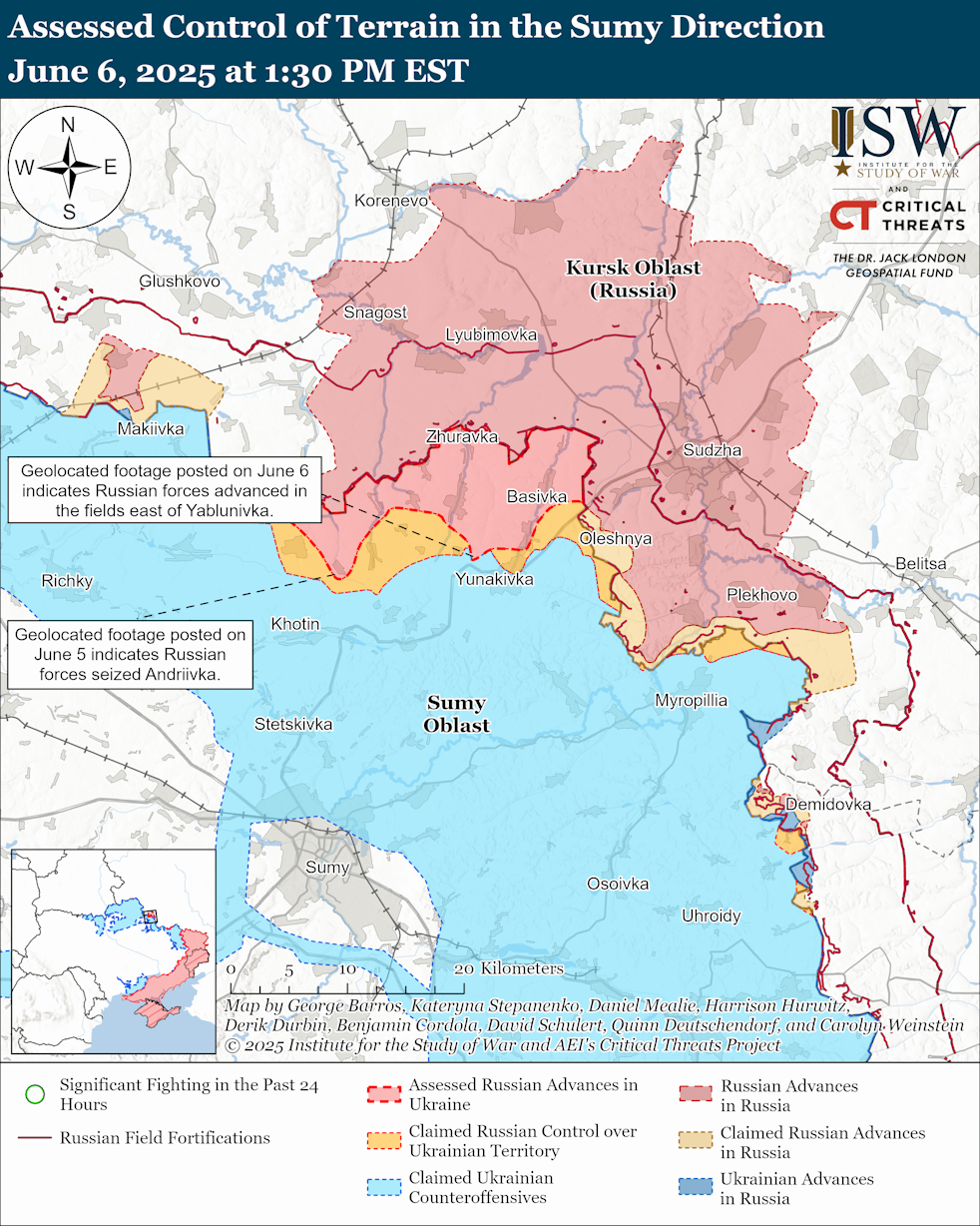 Также сообщается, что российские войска провели наземные атаки к северу от Сум возле Кондратовки, Алексеевки, Новониколаевки и Андреевки, а также к северо-востоку от Сум возле Яблоновки и Юнаковки. В то же время украинские силы контратаковали возле Писаревки, к северу от города Сумы.