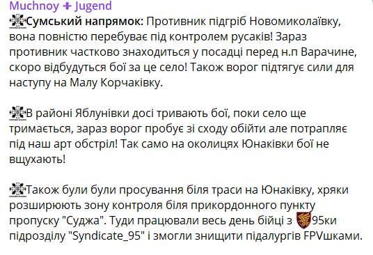 Аналитики ISW со ссылкой на неподтвержденные утверждения российских "военкоров" отмечают, что ВС РФ якобы продвинулись до Варачино (севернее города Сумы) и на север от Запселья и Мирополья, к северо-востоку от областного центра.