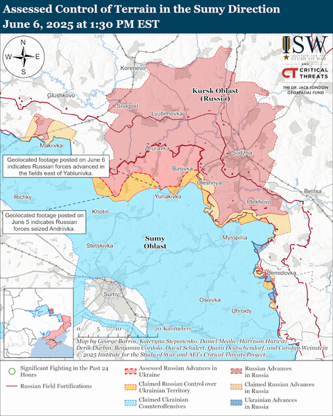 Отмечается, что российские войска продвинулись на юг от села Андреевка, к северу от областного центра и, вероятно, захватили населенный пункт. Кроме того, российские войска продвинулись на юго-восток от Яблоновки.