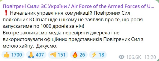 Комментарий командования появился в полдень 7 июня. Отмечается, что Игнат никогда не говорил о способности ВС РФ запускать каждую ночь по тысяче дронов. Кроме того, журналистов попросили "проверять источники" и не делать "хайп" на заявлениях представителя Воздушных сил.