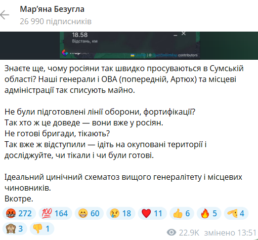 "Почему россияне так быстро продвигаются в Сумской области? Наши генералы и ОВА (предыдущий, Артюх) и местные администрации так списывают имущество. Не были подготовлены линии обороны, фортификации? Так кто же это докажет — они уже у россиян. Не готовы бригады, убегают? Так уже же отступили — идите на оккупированные территории и исследуйте, убегали ли и были ли готовы", — написала она.