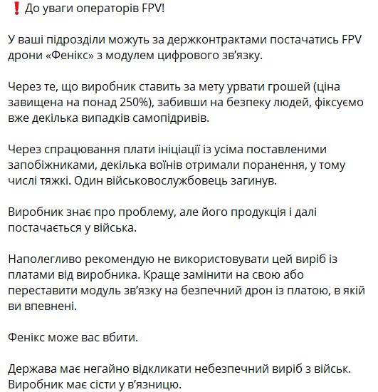 Волонтер напомнил о другом сообщении, которое появилось в сентябре 2024 года. Сообщение объясняло, что не так с "Фениксами". Выяснилось, что дроны имеют проблемы с модулем цифровой связи и платами инициации. Из-за самовольного срабатывания платы несколько бойцов получили ранения, а один — погиб, подчеркнул Стерненко. Он посоветовал военным "не использовать это изделие с платами от производителя" и заявил, что производитель якобы завысил цену на 250%, но "забил на безопасность людей".