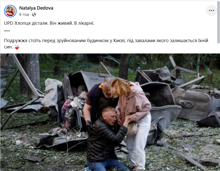 Журналистка Наталья Дедова опубликовала сообщение о том, что после массированной атаки на Киев в ночь на 17 июня в Соломенском районе достали из-под завалов дома живым парня, освобождения которого ждали родители. В ГСЧС сообщили, что не могут подтвердить эту информацию.