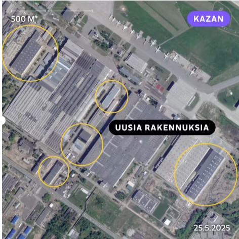 РФ увеличивает возможности авиационного завода в Казани, который специализируется на производстве самолетов различных типов, в частности стратегических бомбардировщиков Ту-95мс и Ту-160, а также самолетов дальней авиации Ту-22М3. Сейчас россияне возвели несколько новых ангаров, а их ввод в эксплуатацию состоится не раньше конца 2026 года, сообщает финский вещатель Yle.