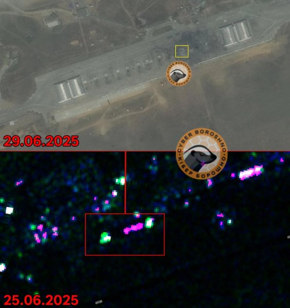 Команда также опубликовала фото Sentinel-1 от 25 июня, которые подтверждают, что группа российских военных самолетов ранее базировалась именно в этом месте.