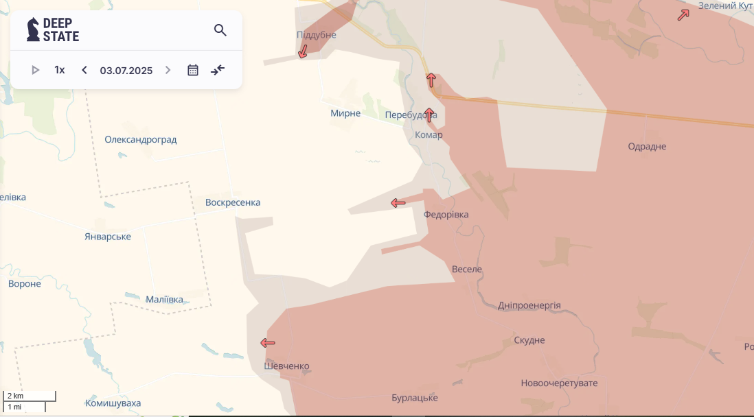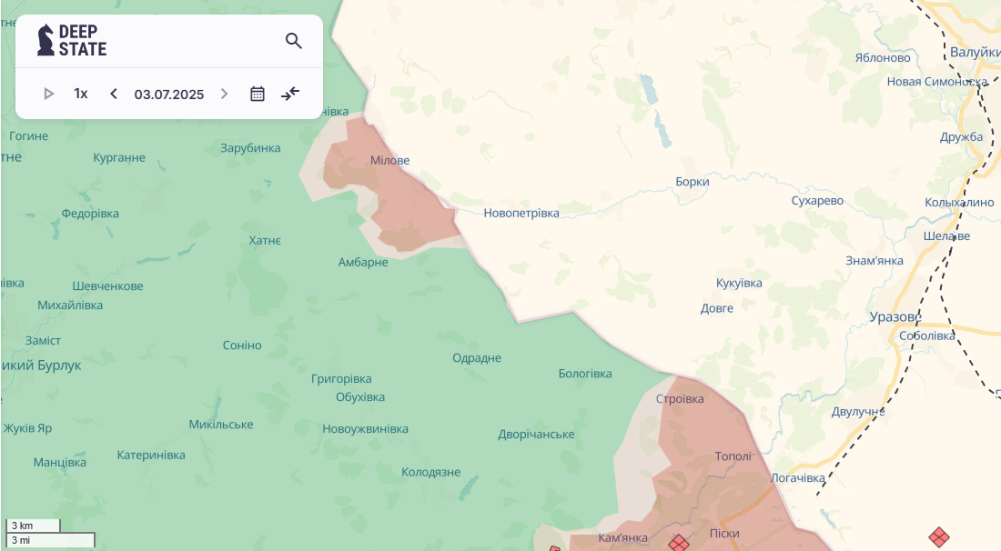 Россияне смогли оккупировать два населенных пункта — Меловое и Строевку, расположенные неподалеку от границы Украины с Россией в Харьковской области. Об этом сообщили аналитики проекта DeepState в ночной сводке о ситуации на фронте ночью 4 июля.