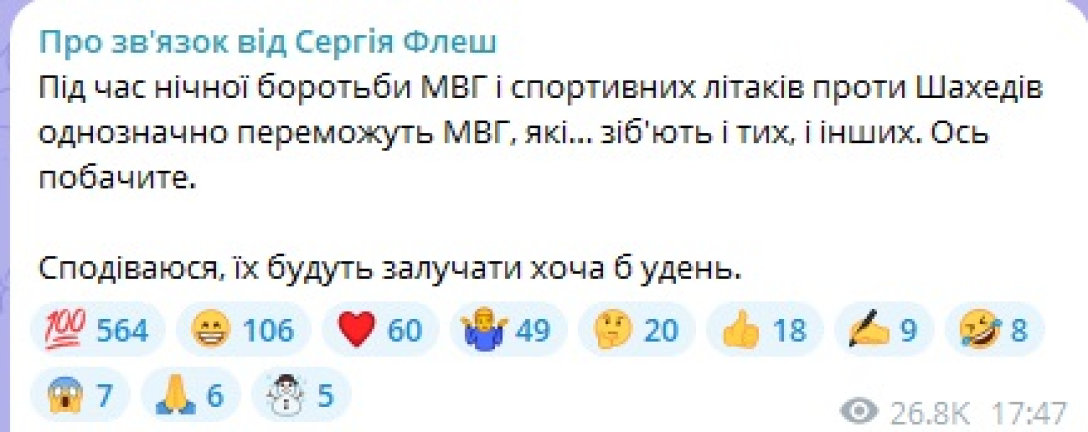 "Во время ночной борьбы МВГ (мобильные огневые группы — ред.) и спортивных самолетов против Шахедов однозначно победят МВГ, которые... собьют и тех, и других. Вот увидите. Надеюсь, их будут привлекать хотя бы днем", — написал Сергей Флеш.