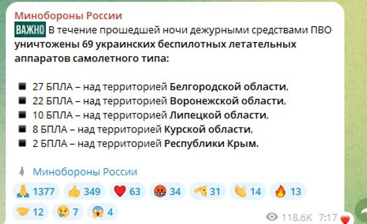 Минобороны России заявило об уничтожении 120 дронов за ночь. Впрочем в списке атакованных регионов Краснодарский край не упоминается.