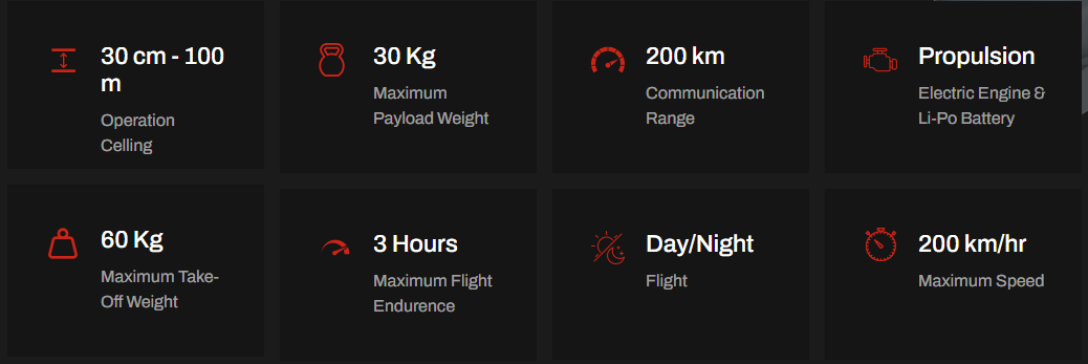 TALAY оборудован электродвигателями, которые дают ему скорость в 200 км/ч. С помощью ретрансляторов нисм можно управлять на расстоянии до 200 км. Дрон-камикадзе может находиться в воздухе до 3 часов.