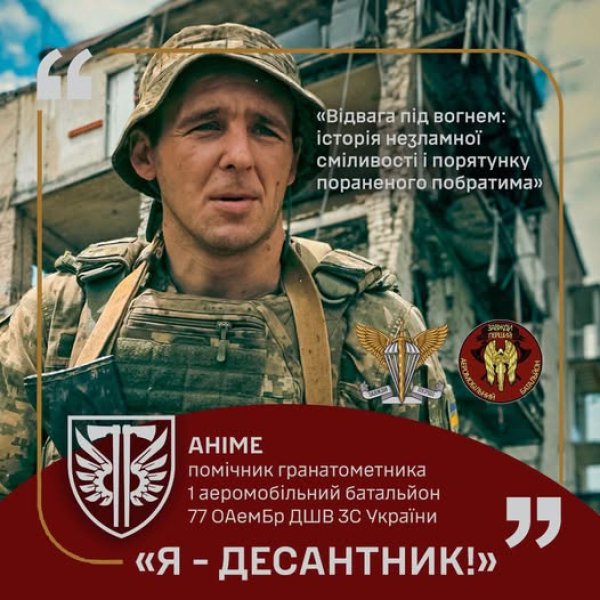 Десантник 77-й ОАеБр с позывным "Аниме" спас жизнь раненого собрата, выведя его из-под российского миномета. Об этом случае рассказала пресс-служба 77-й отдельной аэромобильной Надднепрянской бригады ДШВ ВСУ.