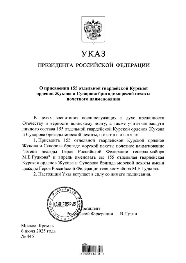 Сама 155 бригада морской пехоты ВС РФ указом, подписанным президентом России Владимиром Путиным 6 июля, теперь носит имя погибшего заместителя главнокомандующего ВМФ РФ Михаила Гудкова.