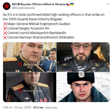 Перечень уничтоженных в результате удара по Коренево 2 июля также состоит из еще двух офицеров, в том числе заместителя командующего ВМС РФ Михаила Гудкова. Новые имена идентифицировали аналитики проекта Russian Officers Killed in Ukraine в сети X 10 июля.